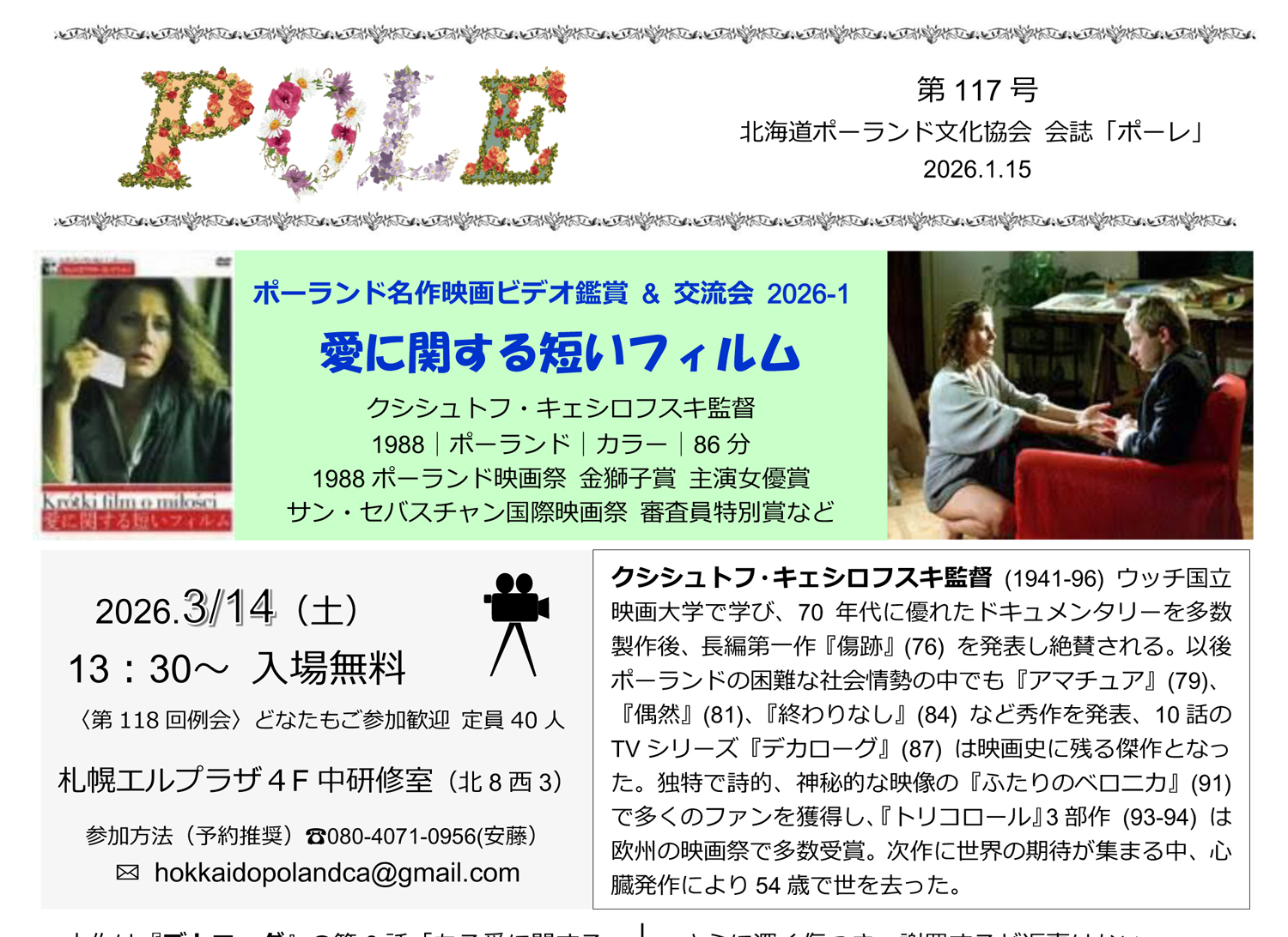 《第118回例会》『愛に関する短いフィルム』1988│クシシュトフ・キェシロフスキ Krzysztof Kieślowski 監督、札幌エルプラザ4F中研修室、2026年3月14日 (土) 13:30〜[誤記訂正済み]入場無料、予約推奨 申込先 TEL 080-4071-0956 (安藤) mail: hokkaidopolandca@gmail.com
