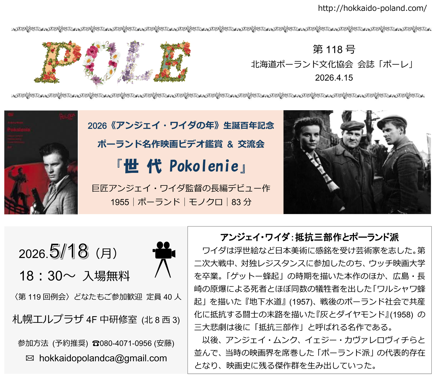 《第119回例会》『世代 Pokolenie』1955│アンジェイ・ワイダ Andrzej Wajda 監督 - 2026《アンジェイ・ワイダの年》生誕百年記念, 札幌エルプラザ4F中研修室 (北8西3) 2026年5月18日 (月) 18:30〜, 入場無料, 予約推奨 申込先 TEL 080-4071-0956 (安藤) mail: hokkaidopolandca@gmail.com