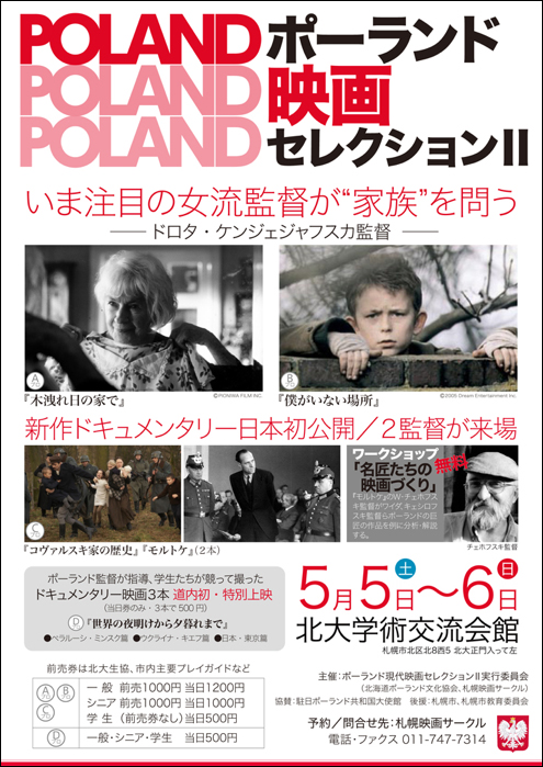 《第60回例会》ポーランド映画セレクションII (柏木由美子; 佐光伸一; 観客アンケート) 北大学術交流会館 2012.5.5-6 @『木洩れ日の家で』2007 ドロタ・ケンジェジャフスカ監督 A『僕がいない場所』2005 同監督 B『コヴァルスキ家の歴史』2009 アルカディウシュ・ゴウェンビエフスキ監督 (ゲスト) &マチェイ・パヴァリツキ監督&『モルトケ』2011 ヴァルデマル・チェホフスキ監督 (ゲスト) C『世界の夜明けから夕暮れまで』ミンスク・キエフ・東京篇 2011 同監督, ワークショップ「名匠たちの映画づくり」同監督, 共催:札幌映画サークル ※2017.2.19『木洩れ日の家で』の主演女優ダヌタ・シャフラルスカさん(102) 逝去, 心よりご冥福をお祈りします