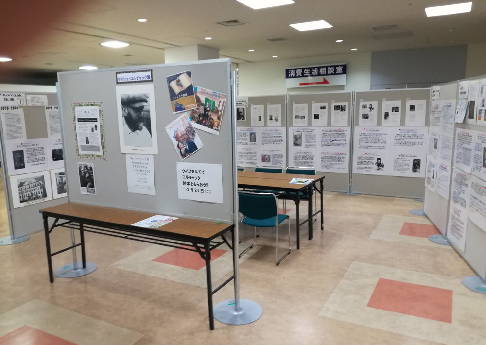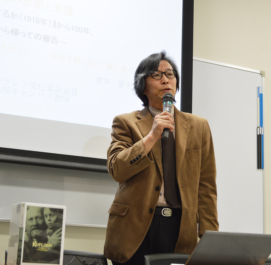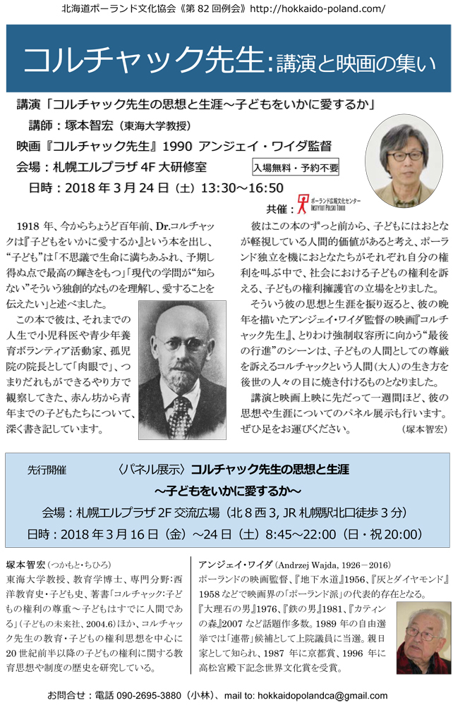 《第82回例会》コルチャック先生: 講演と映画の集い, 講演「コルチャック先生の思想と生涯〜子どもをいかに愛するか」塚本智宏&映画『コルチャック先生』1990 アンジェイ・ワイダ監督, 札幌エルプラザ 2018.3.24〈パネル展〉コルチャック先生の思想と生涯 3.16〜24, 共催: ポーランド広報文化センター ※コルチャック:子どもの権利の尊重〜子どもはすでに人間である, 塚本智宏著, 子どもの未来社, 2004.6 =左写真=塚本智宏 =中=聴衆 (松山敏撮影)=右=パネル展