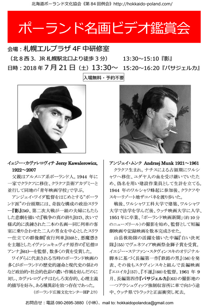 《第84回例会》ポーランド名画ビデオ鑑賞会『影 Cień』1956|イェジー・カヴァレロヴィチJerzy Kawalerowicz監督&『パサジェルカ Pasażerka』1963|ムンク監督, 札幌エルプラザ 2018.7.21