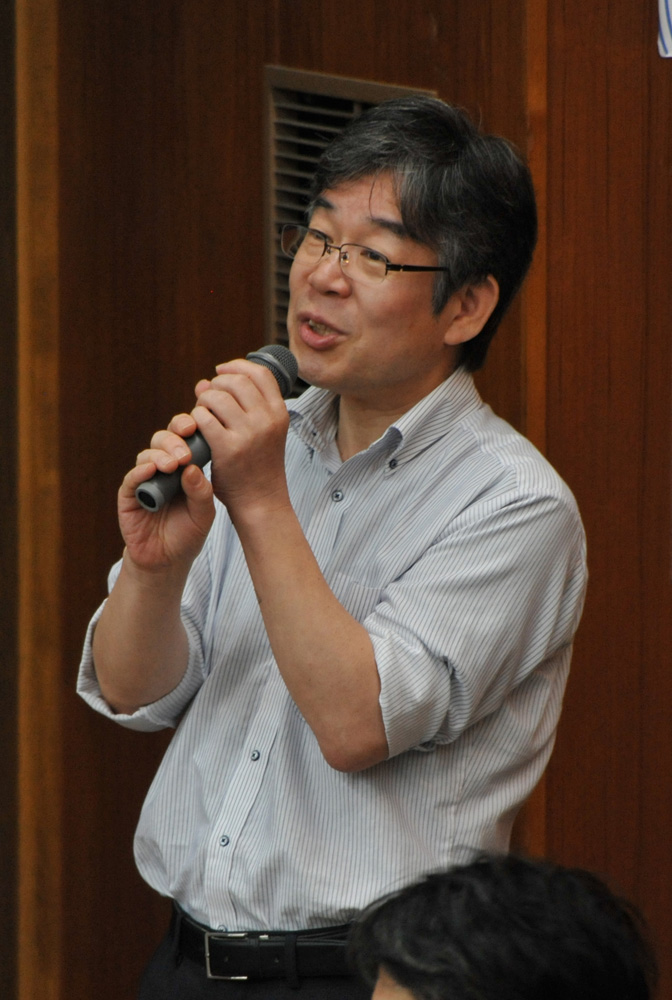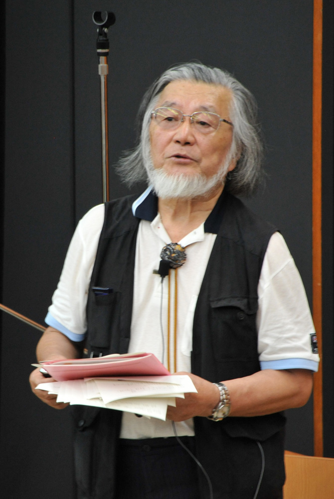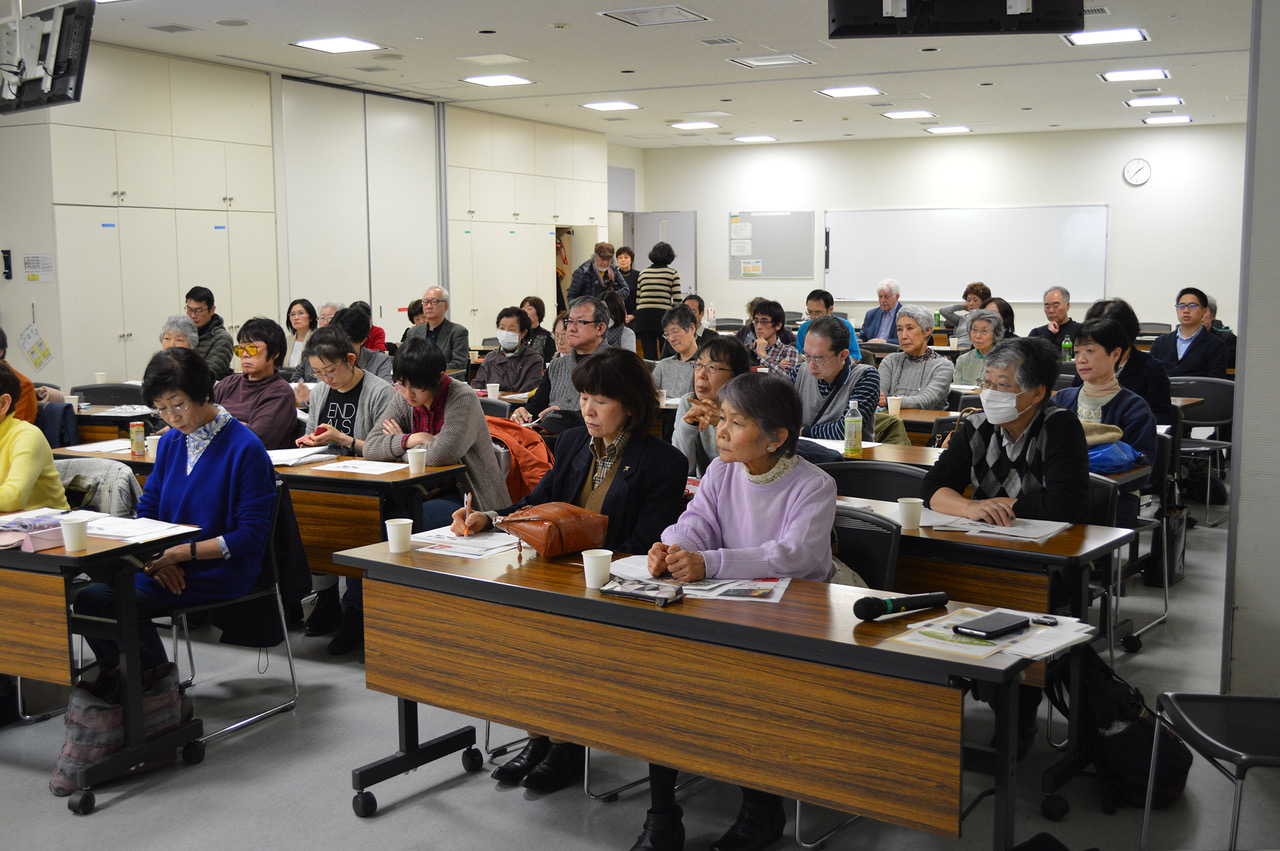 =左から=挨拶: 木村, 講演: 井上, 佐々木, 新井, 朗読: 長屋, 白井, 酒谷の各氏 (写真 尾形芳秀)