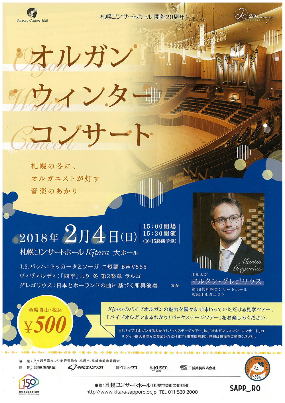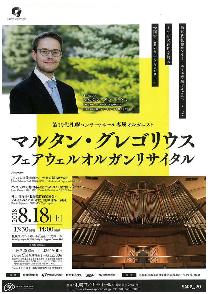 ♫第19代Kitara専属オルガニスト マルタン・グレゴリウス フェアウェルオルガンリサイタル, Kitara 2018.8.18 (写真 札幌市芸術文化財団; 尾形芳秀)