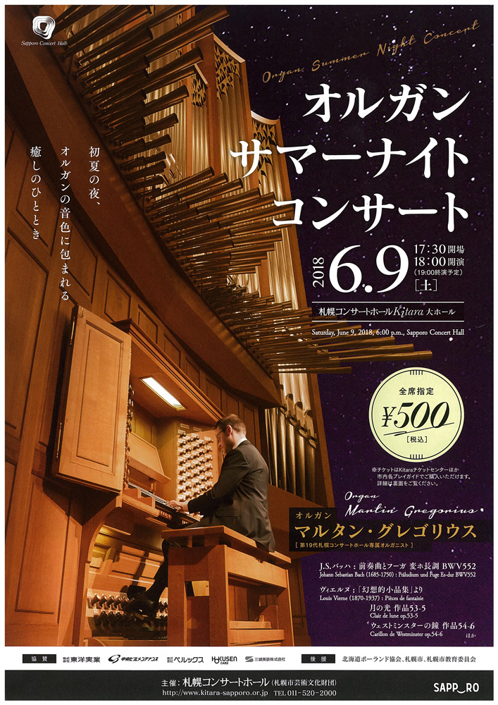 〈後援〉♫オルガンサマーナイトコンサート:マルタン・グレゴリウス, Kitara大ホール 2018.6.9, 北海道新聞: 三浦洋, blog
