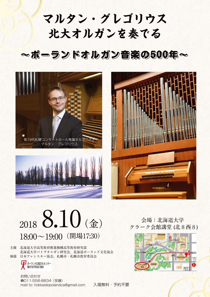 《第86回例会》♪マルタン・グレゴリウス Martin Gregorius 北大オルガンを奏でる〜ポーランド オルガン音楽の500年, 北大クラーク会館 2018.8.10, 北海道新聞, 北大オルガン: CoSTEP #1; video #1, 旧帝大のパイプオルガン, 共催: 北大パイプオルガン研究会 =左写真=終わりの挨拶 =中=安藤厚, 西端克俊, Martin Gregorius, 高橋健一郎, 徳田貴子 =右=交流会