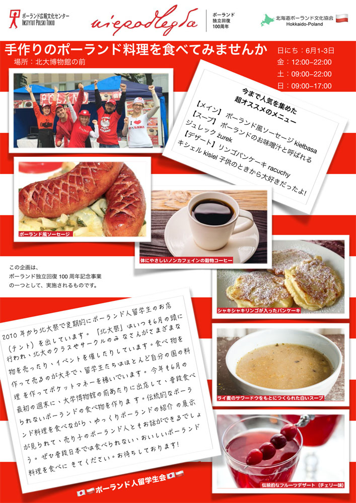 〈後援〉北大祭2018 ポーランド料理テントPolski Namiot, 北大総合博物館前 6.1-3, 主催: 北大ポーランド人留学生会, 協賛: ポーランド広報文化センター