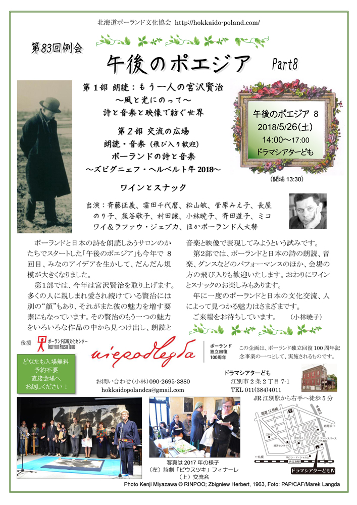 《第83回例会》朗読会 午後のポエジア8: 村田譲, ドラマシアターども 2018.5.26 @朗読: もう一人の宮沢賢治〜詩と音楽と映像で紡ぐ世界 A交流の広場/ポーランドの詩と音楽〜ズビグニェフ・ヘルベルト年2018: 若いクジラの葬式; ためらうニケ (ラファウ・ジェプカ; 佐藤圭史訳) album, blog =右写真= Zbigniew Herbert 1963 ©PAP/CAF/Marek Langda