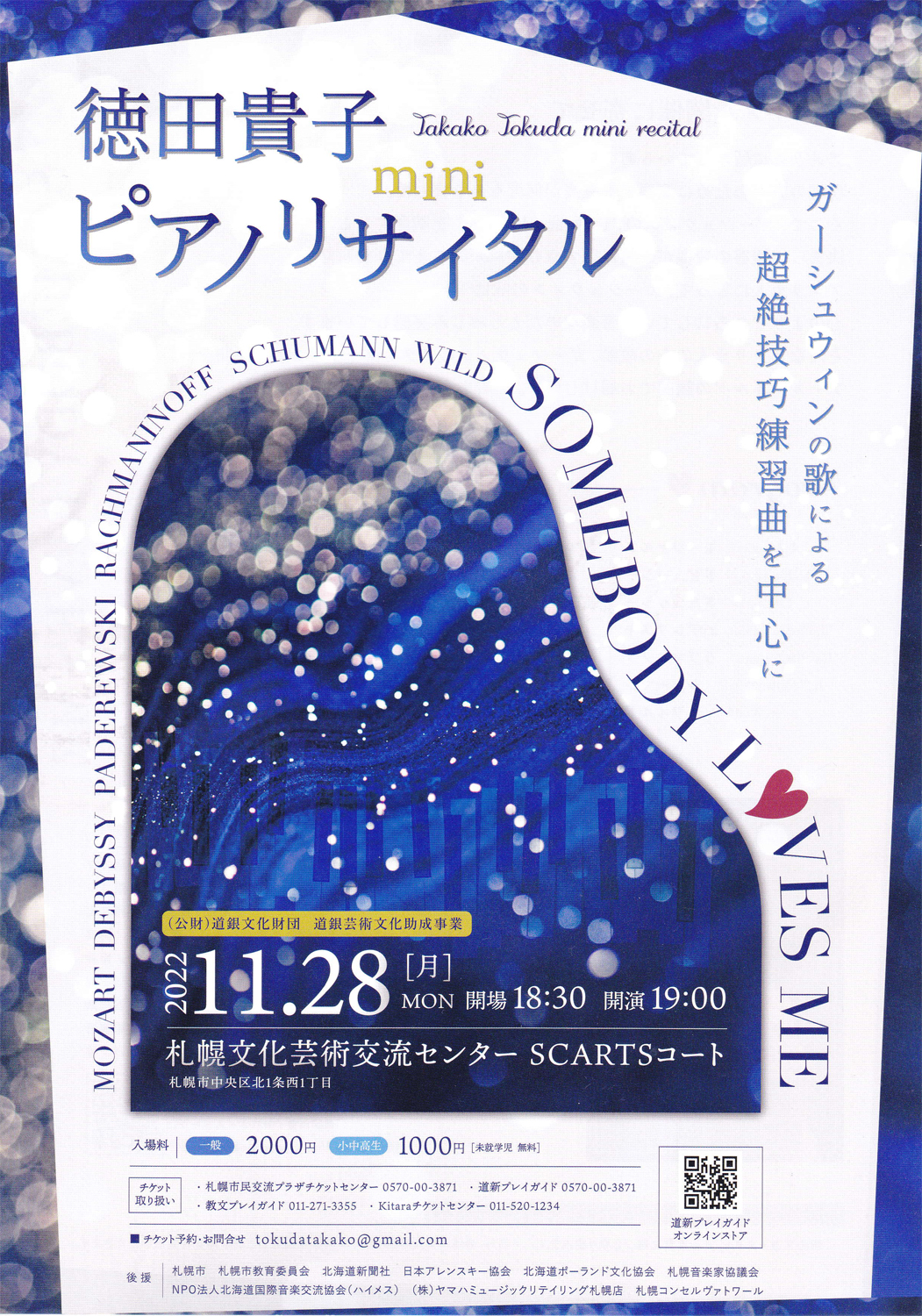 〈後援〉♫徳田貴子ミニピアノリサイタル〜ガーシュウィンの歌による超絶技巧練習曲を中心に Somebody Loves Me, 札幌文化芸術交流センターSCARTSコート 2022.11.28