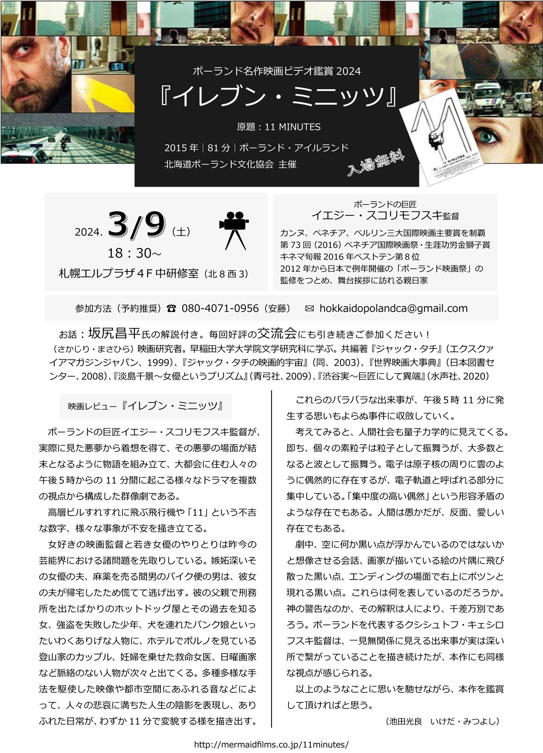 《第110回例会》2024.3.9『イレブン・ミニッツ 11 minutes』2015|イエジー・スコリモフスキ Jerzy Skolimowski 監督, お話: 坂尻昌平