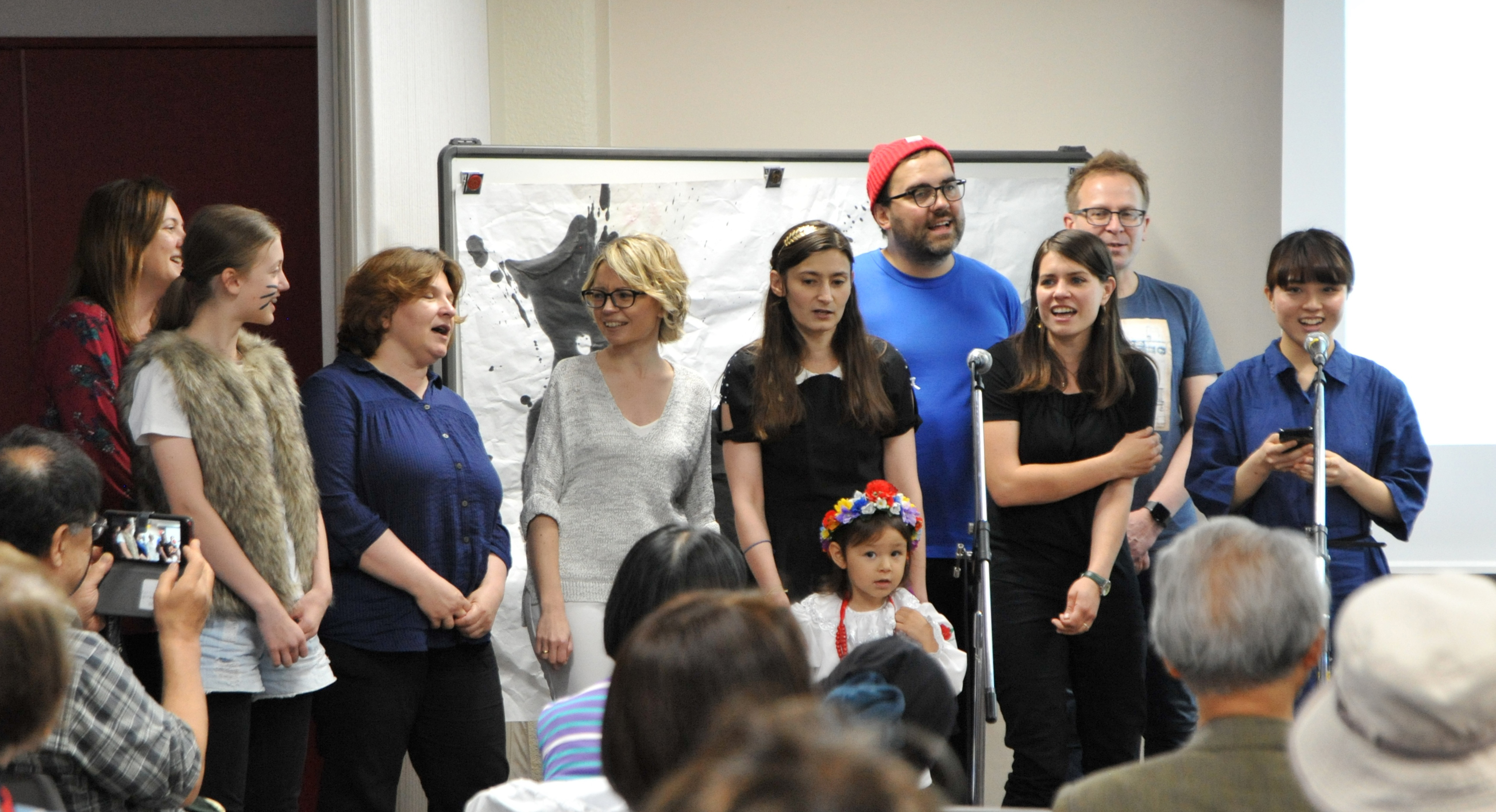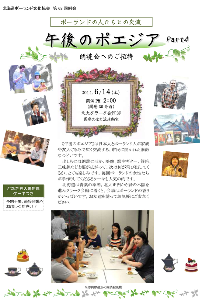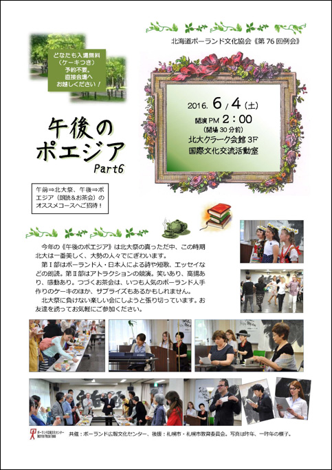 《午後のポエジア》は, 日本人とポーランド人が家族や友人ぐるみで広く交流する素敵なつどいです。出しものは朗読のほか, みなのアイデアを生かして, 映像, 歌やギターなどと広がりました。青葉の季節, お友達を誘ってお気軽にご参加ください