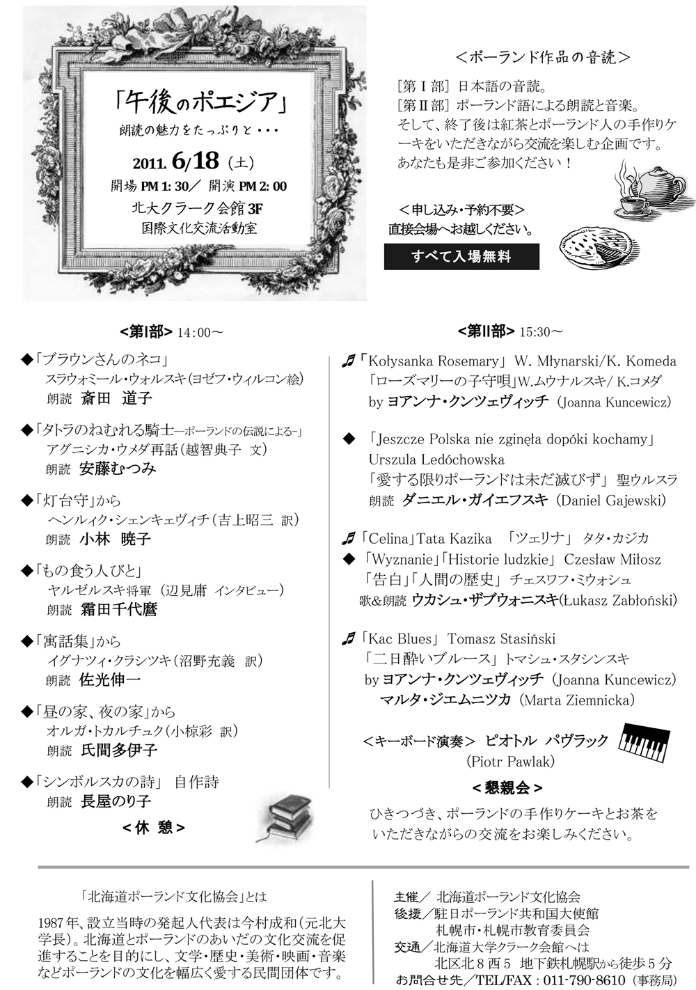 @ポーランドの絵本の紹介や古今の詩の朗読: ポーランドロマン派三大詩人の一人スウォヴァツキ, ノーベル賞詩人 シンボルスカ; ミウォシュ, 生誕95年ヘルベルト: 栗原成郎訳, 生誕125年トゥヴィム, 自作詩「Mrs. Mの語ったショパン」長屋のり子 ほか