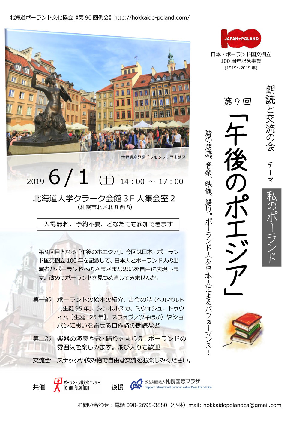 《第90回例会》朗読会 午後のポエジア9 〜私のポーランド - 日本・ポーランド国交樹立100周年記念: 嵩文彦; 徳田貴子; 坂田朋優, 北大クラーク会館 2019.6.1